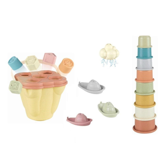 Sada hraček do vody 5v1 v praktickém kyblíku promění každou koupel v zábavnou hru. Lodičky, kelímky a obláček, uložené v kyblíku, který je současně i vkládačkou, se postarají o to, že koupání ve vaničce, vaně nebo v bazénku nebude nuda. K nabírání vody, přelévání a polévání poslouží stohovací kelímky s čísly nebo kyblík, na vlnách se pohoupou barevné loďky a z obláčku zaprší vždy, když se naplní vodou..