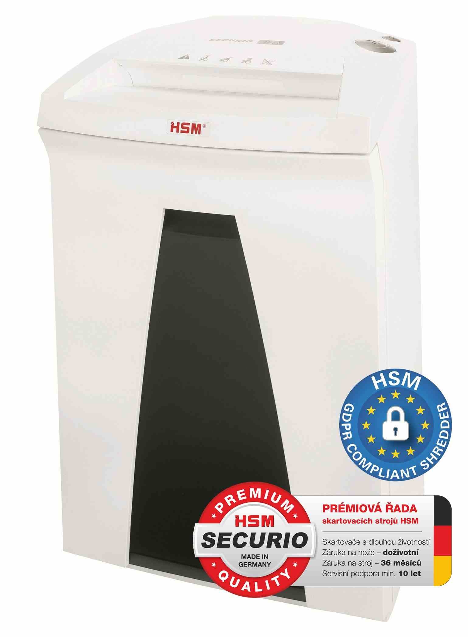 Základní skartovací stroj střední třídy. Obsahuje všechny prvky moderních skartovačů. Multifunkční ovladač s kontrolkami, systém úspory elektrické energie EMCS, masivní nože umožňující skartování papírů i s kancelářskými sponkami a plastovými kartami. Do odpadního zásobníku s průhledem je možné umístit plastový pytel (není povinný). Tento řez je vhodný pro uživatele preferující vyšší stupeň utajení. HSM Securio B24 vyniká tichým chodem, úsporností, zvýšeným výkonem a spolehlivostí. Záruka na stroj 60 měsíců, doživotní na nože. Stroj je vyráběn v Německu, s podporou dodávky náhradních dílů pro případ opravy..