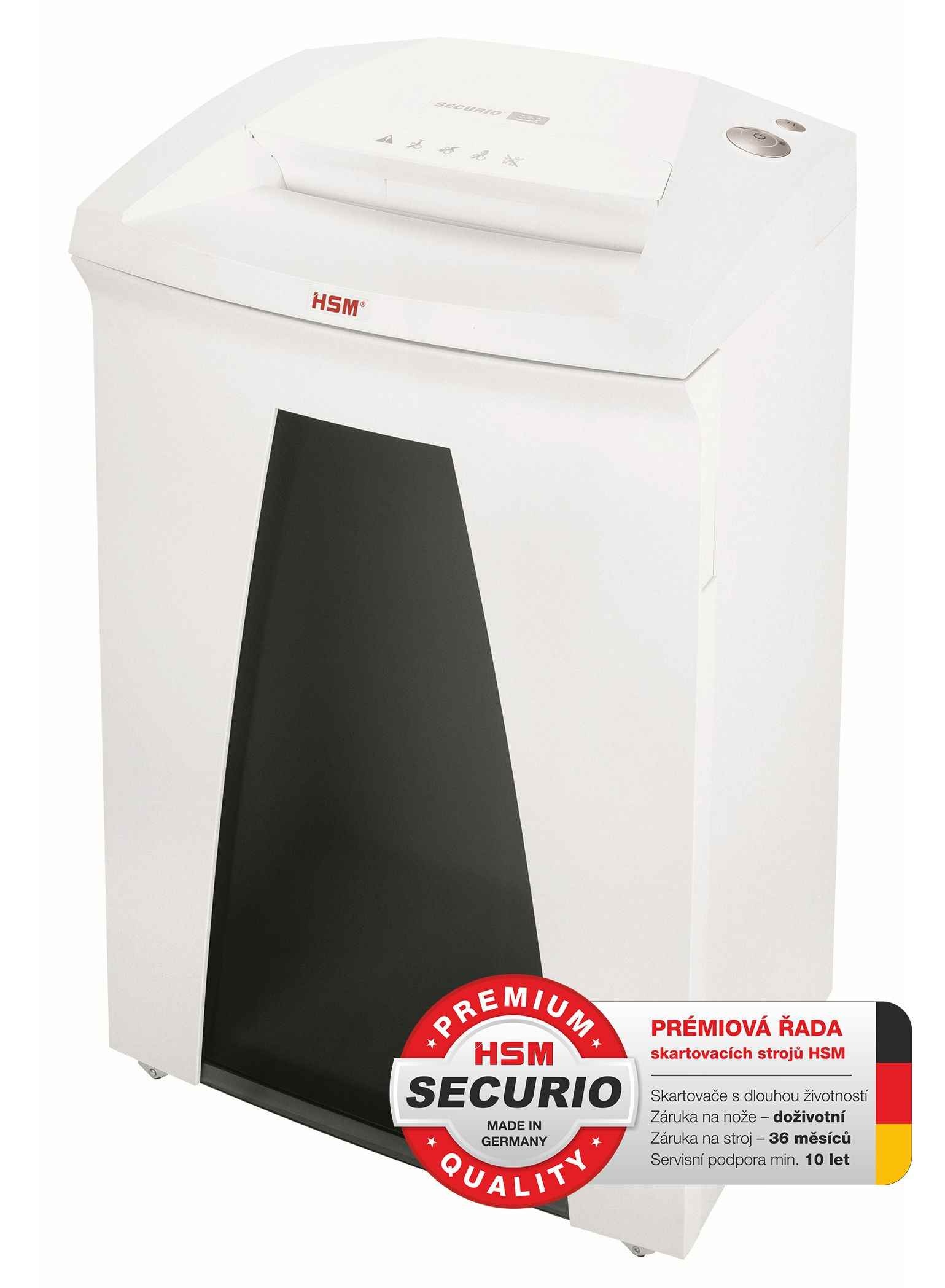 Skartovací stroj střední třídy se vstupem pro papír formátu A3. Obsahuje všechny prvky moderních skartovačů. Multifunkční ovladač s kontrolkami, systém úspory elektrické energie EMCS, masivní nože umožňující skartování papírů i s kancelářskými sponkami, plastových karet a CD/DVD. Pro případ separace nepapírového materiálu je možno pod hlavu nasunout závěs s tkaninovým vakem. Odpadní prostor je řešen závěsem s plastovým pytlem o zvětšeném objemu 82 l. Tato verze je vhodná pro uživatele preferující základní proužkový řez. HSM Securio B32 vyniká tichým chodem, úsporností, zvýšeným výkonem a spolehlivostí. Záruka na stroj 60 měsíců, doživotní záruka na nože. Stroj je vyráběn v Německu, s podporou dodávky náhradních dílů pro případ opravy..