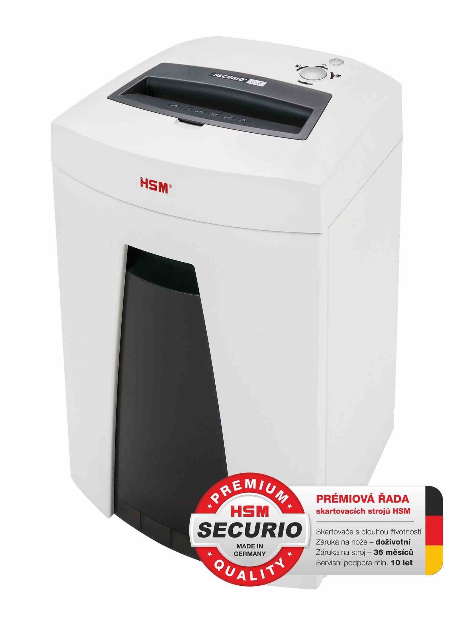 Skartovací stroj řady HSM Securio v kategorii ke stolu se zvýšeným výkonem. Masivní ocelové nože umožňují zpracování papíru i s kancelářskými sponkami a plastové karty. Tato verze je v základním proužkovém řezu. Doba chodu je omezena tepelnou pojistkou. I tak malý stroj je vybaven vstupní fotobuňkou, bezpečnostním dotykovým vypínačem u vstupního otvoru, indikací poruchových stavů a systémem úspory elektrické energie EMCS. Skartovaný odpad padá do čelně výsuvného zásobníku. Záruka na stroj je 60 měsíců, doživotní záruka na nože. Stroj je vyráběn v Německu, s podporou dodávky náhradních dílů pro případ opravy..
