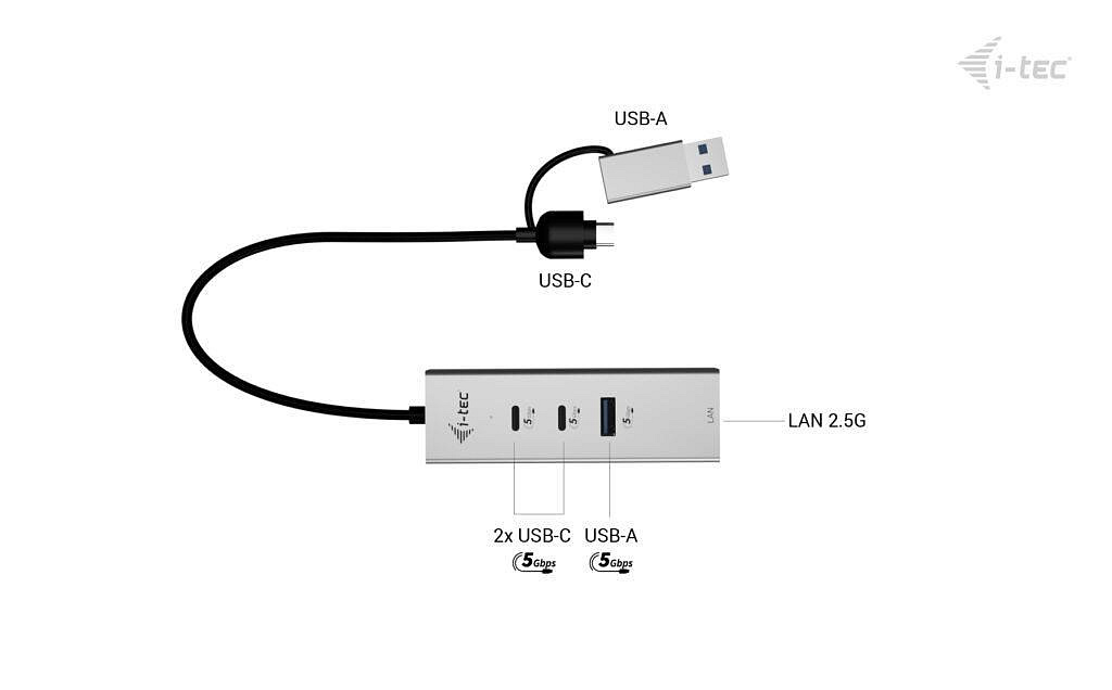 Hub nabízí dva USB-C a jeden USB-A port pro připojení periferií, jako jsou externí disky, klávesnice nebo další příslušenství. Nechybí ani rychlý 2.5 Gigabit Ethernet port, který poskytuje výrazně vyšší rychlost a stabilitu připojení oproti běžnému Gigabit LAN – ideální pro práci s velkými daty, online meetingy i streamování.