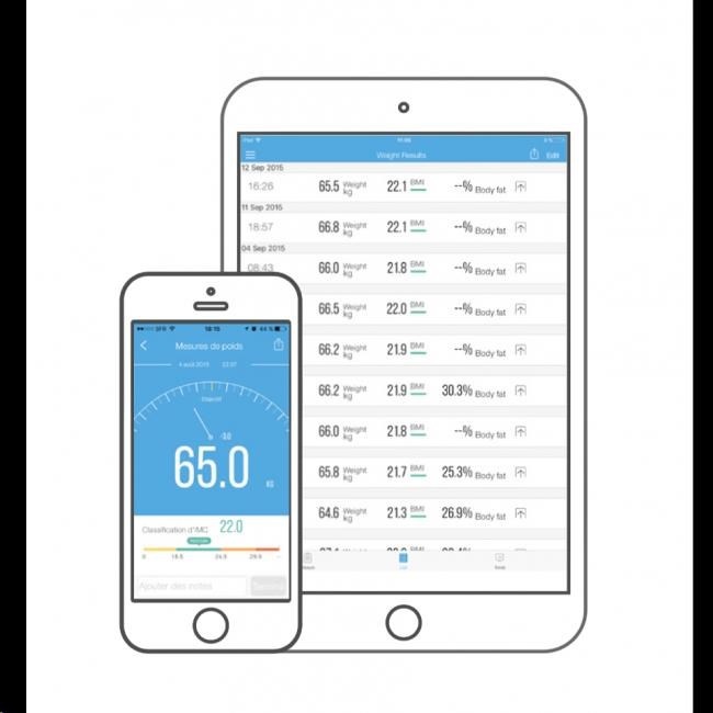 Při použití vašeho smartphonu (nebo tabletu) při vážení získáte okamžitě přehled o všech aktuálních údajích. Stačí zapnout Bluetooth a spustit aplikaci MyVitals. Jakmile vstoupíte na váhu, dojde k automatickému přenosu a vyhodnocení dat. Aktuální hmotnost hned vidíte také na obrazovce.
