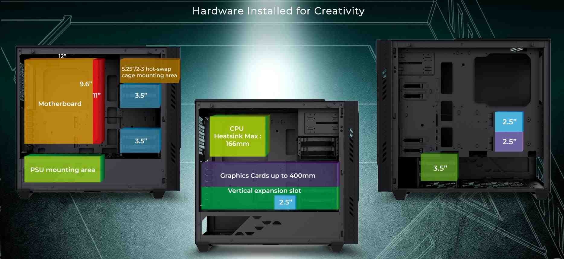 | Maximum Compatibility | VGA Card Length: 400mm (Maximum) (Length up to 7 x 400mm slots when removing 4 x 3.5’’ HDD Cages ) VGA Card Width: 170mm (Maximum) CPU Heatsink Height: 166mm (Maximum) |