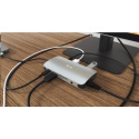 Malá kovová USB-C dokovací stanice, která dokáže snadno připojit externí monitor či projektor, a to prostřednictvím portu HDMI nebo VGA. Jednoduše připojte váš notebook či tablet (instalace ovladačů není nutná) a využijte rychlého datového USB, připojení k internetu prostřednictvím LAN portu, spolu s možností připojit vaše sluchátka a mikrofon. Samozřejmostí je podpora napájení vašeho notebooku, a to až do 100 W, což znamená, že budete schopni nabít všechny notebooky a tablety, které nabíjení prostřednictvím USB-C (USB-C Power Delivery) podporují.
