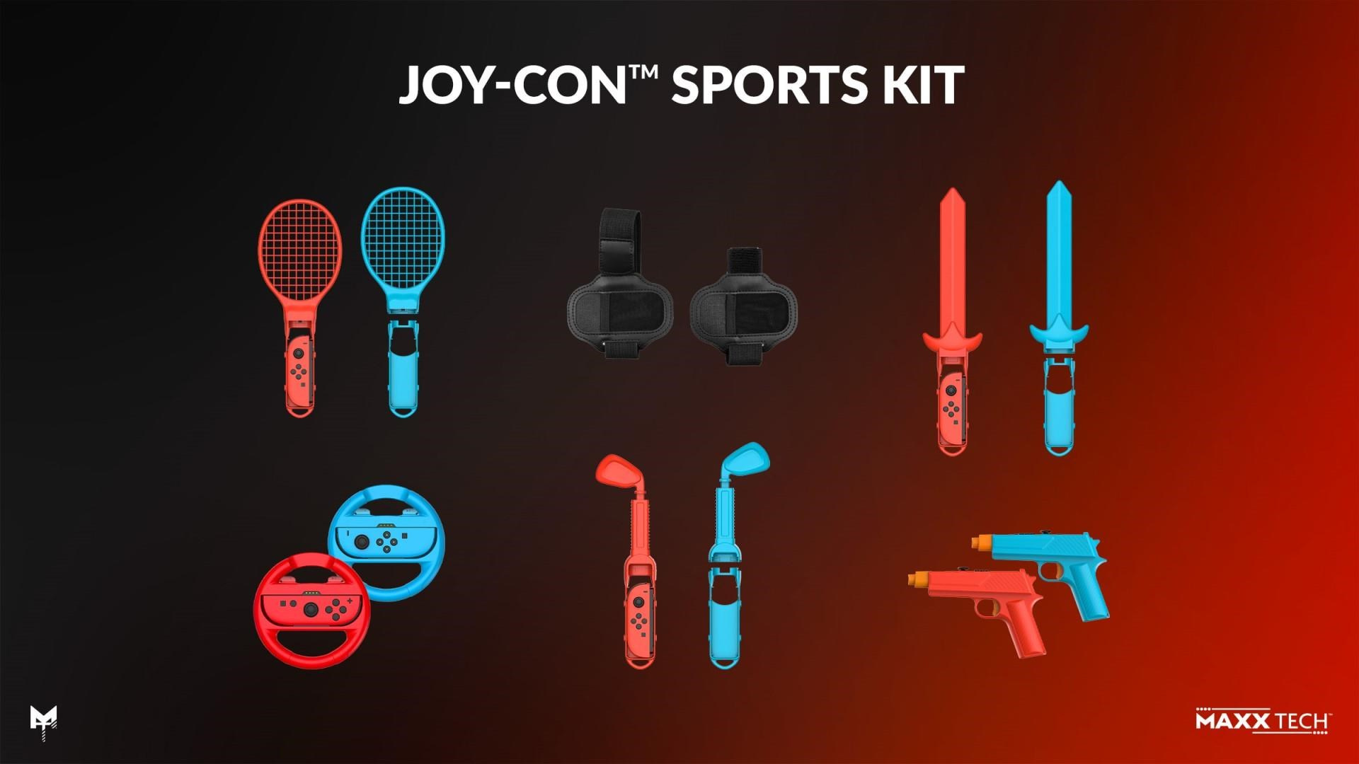 Obsah balení: 2 závodní volanty, 2 tenisové/badmintonové rakety, 2x 2v1 popruhy, 2 meče, 2 golfové hole, 2 pistole, 2x rukojetí Joy-Con, 2x adaptéry.