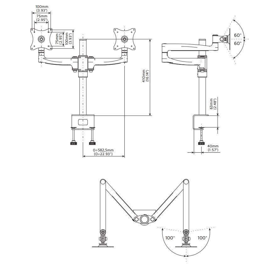 Kancelářský stolní držák na 2 monitory Edbak DM121 Profesionální kancelářský držák na 2 monitory 17-27", otočný +/-180°, sklopný +/-60°, výškové nastavení 100-405mm, délka 0-582mm, pivot, 2 stolové úchyty, VESA 75x75 a 100x100, nosnost 20kg Držáky značky Edbak vždy vynikali svou kvalitou a nastavitelností, nyní i se zaměřením na design, který je reprezentativní a nadčasový. Stolní držák Edbak DM121 je vhodný na všechny typy a značky monitorů, jejichž úhlopříčka 17" až 27". Držák je plně nastavitelný - otáčení do stran, náklon, rotace monitoru (PIVOT), korekce roviny, nastavení výšky a vzdálenosti. Držák podporuje VESA standardy 75x75 a 100x100, nosnost je 20kg. Barevné provedení černé matné, materiál hliník. Záruka 10 let. Profesionální kancelářský stolní držák na dva monitory, plně nastavitelný, nejvyšší kvalita, nadčasový design, záruka 10 let - Edbak DM121 Technické údaje: celková nosnost 20kg (10kg na 1 monitor) podpora VESA standardu 75x75 a 100x100 na všechny typy monitorů s úhlopříčkou 17"-27" otáčení do stran +/- 180° náklon monitoru +/- 60° nastavení vzdálenosti od nosníku 0mm až 582mm nastavení výšky 100mm až 405mm funkce PIVOT - polohování monitoru na šířku nebo na výšku součástí balení jsou 2 stolové úchyty - uchycení na okraj stolu nebo do prostoru stolu uchycení na stolové desky o síle 10mm až 63mm krásný nadčasový design, profesionální kvalita a zpracování snadné nastavení polohy monitorů materiál hliník + litina barevné provedení černé záruka 10 let Profesionální stolní držák na 2 monitory, plně polohovatelný Edbak DM121 Držák na 2 monitory Edbak DM121 podporuje VESA standardy: VESA 75x75 VESA 100x100.