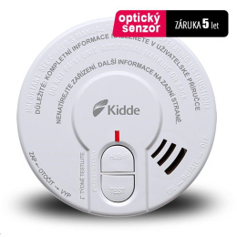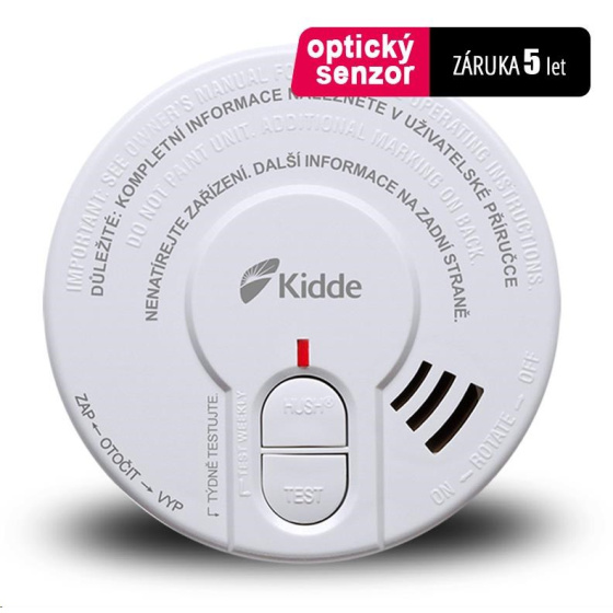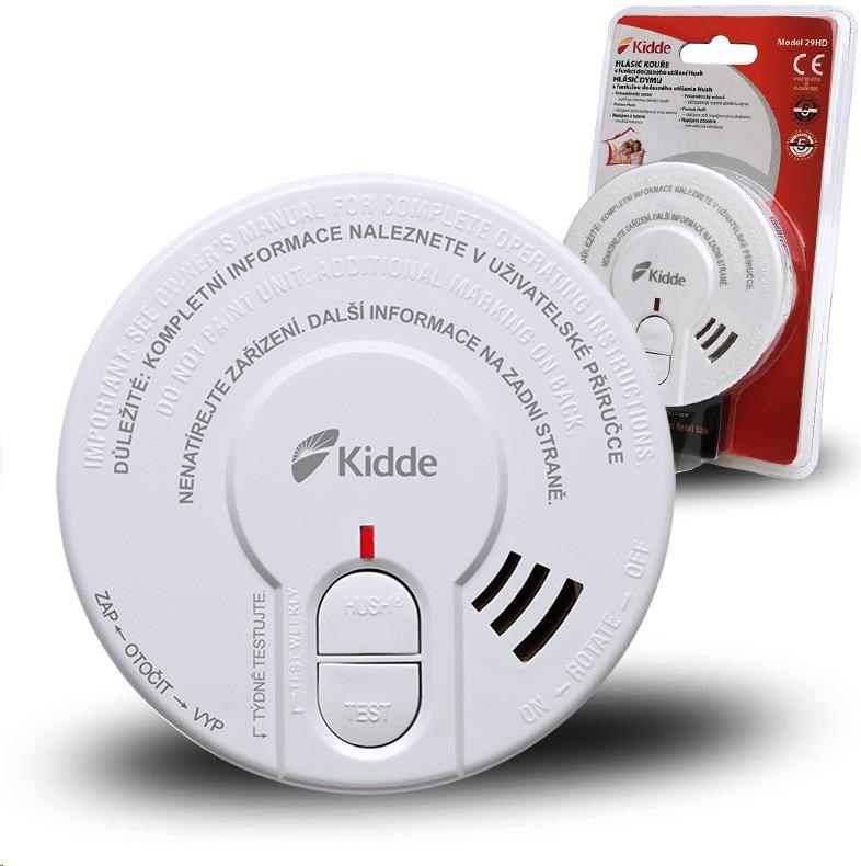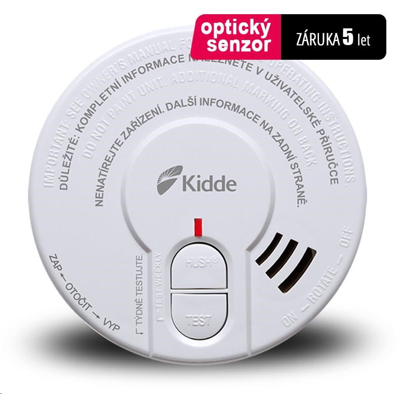 Hlásič požáru je vybaven testovacím tlačítkem TEST pro kontrolu správného fungování zařízení a HUSH pro přechodné umlčení požárního hlásiče pro případ planého alarmu. Stisknutí tlačítka způsobí okamžitou deaktivaci alarmu, na dobu asi 10minut, snížení citlivosti obvodů a vypnutí akustické signalizace hlásiče. Tlačítko HUSH používejte pouze tehdy, pakliže znáte příčinu aktivace hlásiče (např. při vaření nebo smažení). Po cca 10 minutách od deaktivace hlásiče se tento zcela automaticky resetuje do původního nastavení pro monitorování nebezpečí požáru. Pokud v místnosti zůstane vysoká koncentrace kouře, můžete stisknout tlačítko HUSH opakovaně a to až do okamžiku kdy je místnost řádně odvětrána. Tento model je vybaven nejmodernějším fotoelektrickým senzorem Kidde.