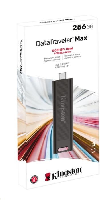 DataTraveler® Max značky Kingston je vysoce výkonný flash disk USB Type-C®1, který využívá nejnovější standard rozhraní USB 3.2 2. generace pro rekordní rychlost čtení/zápisu až 1000/900 MB/s2. Jedinečné pouzdro s prolisem, navržené s ohledem na přenosnost a pohodlí, chrání konektor, když ho nepoužíváte, a lze ho snadno přesunout jediným pohybem. DT Max nabízí špičkový výkon a rozšířené kapacity až 1 TB3, což z něj činí ideální řešení pro přenos a ukládání velkých digitálních souborů, jako jsou fotografie v rozlišení HD, videa v rozlišení 4K/8K, hudba a další.
