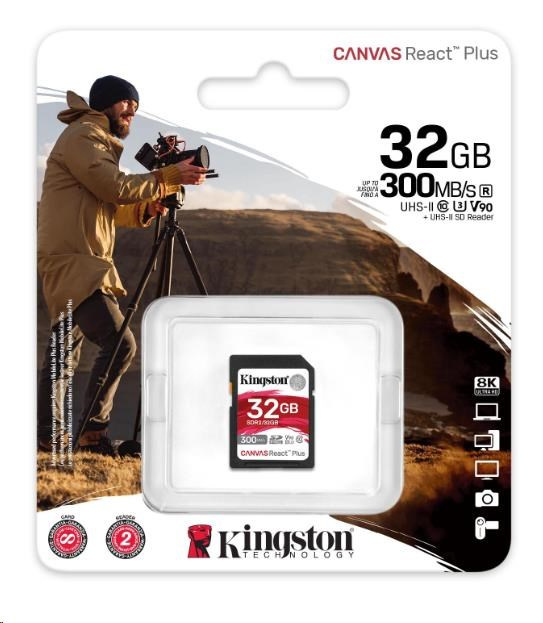 Paměťová karta Canvas React Plus SD společnosti Kingston nabízí vysokou výkonnost a rychlost ideální pro práci se standardními profesionálními kamerami při natáčení videí 4K/8K a pořizování fotografií s vysokým rozlišením. Karta Canvas React Plus SD, vyrobená v souladu s nejnovějšími normami UHS-II a špičkovými rychlostními třídami U3 a V90, vám umožňuje pořizovat sekvenční záběry s rychlostí záznamu až 260 MB/s*. Nechte rozvinout svou kreativitu, nenechte se brzdit pomalou rychlostí a vynecháváním záběrů a maximalizujte své pracovní postupy a efektivitu. Díky rychlosti přenosu až 300 MB/s* vylepšíte svou postprodukční práci a snadno budete zvládat velké pracovní zatížení a dosahovat filmové kvality s vysokým rozlišením.