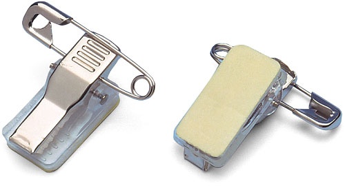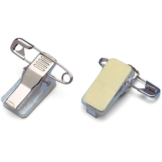 Kovový krokodýlek s pojistným špendlíkem se samolepící zadní stranou. Slouží pro nalepení na zadní stranu jmenovky a následné uchycení jmenovky na oděv..
