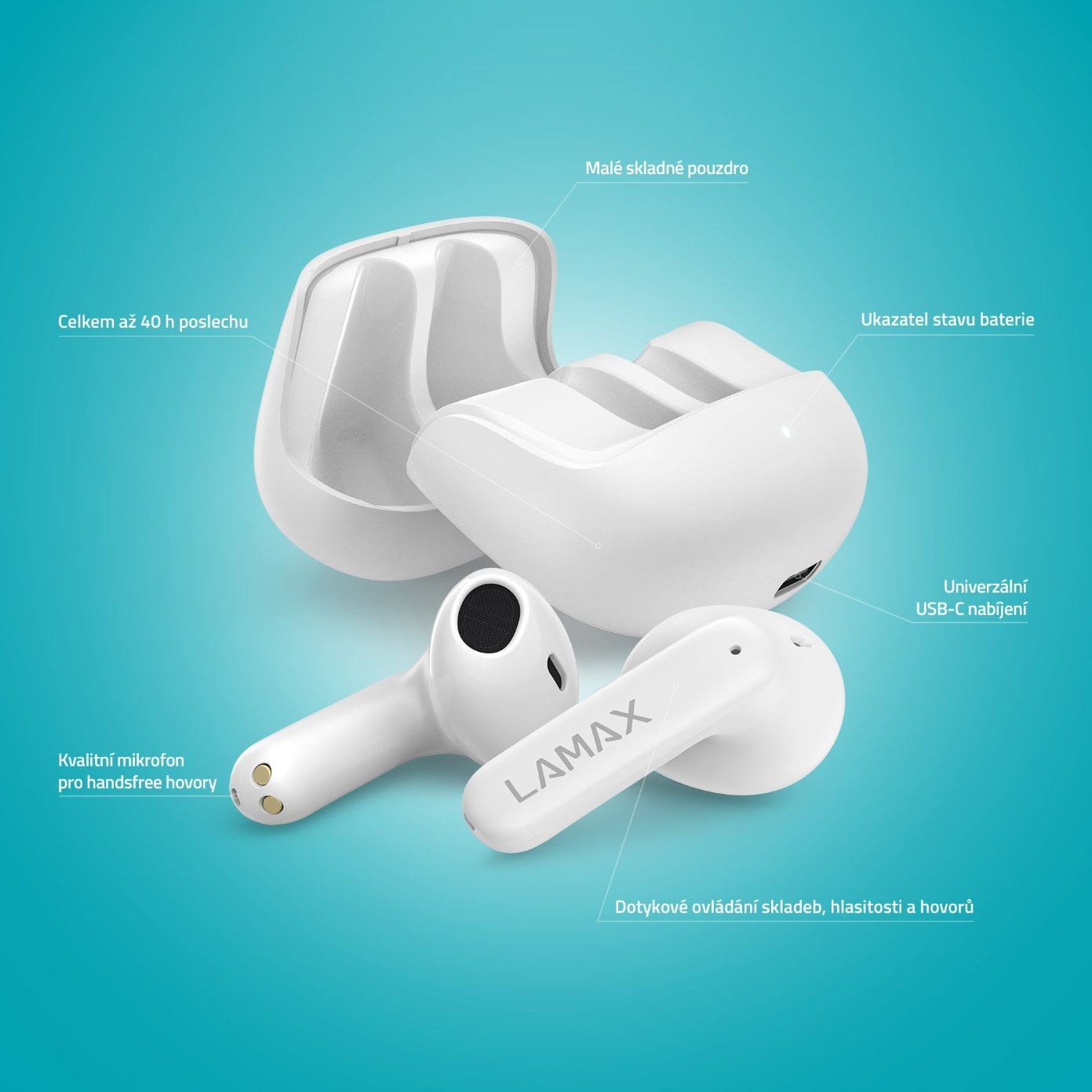 Nebuď bez hudby ani minutuBezdrátová sluchátka LAMAX Tones1 jsou našlapaný pecky od LAMAX! S rychlým Bluetooth 5.3 připojením a dosahem až 15 metrů si můžeš užívat svobodu pohybu a poslechu až 8 hodin na jedno nabití. Extra šťávu na dalších 32 hodin máš s sebou v pouzdru. Užij si parádní zvuk kdykoli a kdekoli, ať už při práci nebo legraci. Kvalitní mikrák pro hovory i ovládání nesmí chybět, tak mačkej play a vyraz ven!
