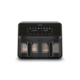 Horkovzdušná fritéza s dvěma koši, celkový objem 8 l, individuální nastavení obou košů zvlášť, možnost přípravy hlavního jídla a přílohy naráz, osvětlení interiéru, průhledná okénka pro vizuální kontrolu pokrmu, 8 přednastavených programů, možnost manuální úpravy času a teploty, technologie Cool Touch a Dualzone®, funkce předehřátí a synchronizované ukončení, přehledný dotykový displej, vnitřní tácy vhodné do myčky, prémiový matný design, 360° cirkulace horkého vzduchu, nastavitelná teplota: 80 – 200 °C, nastavení času 1 – 60 min, příkon 2700 W.