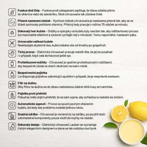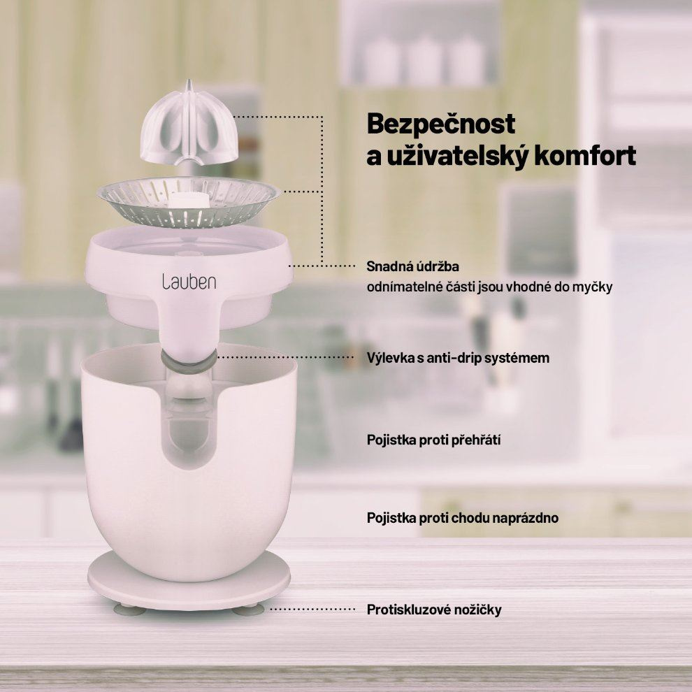 Vyznavačům zdravého životního stylu nesmí doma chybět pomocník v podobě elektrického citrusovače Lauben Electric Citrus Juicer 110WT. Jeho čistý design ozdobí každou kuchyňskou linku, kterou díky funkci Anti Drip nepotřísní ani kapka šťávy. Funkce proti odkapávání zajišťuje, že džus odtéká přímo do sklenice či zůstává v zásobníku. Rychlost otáček při odšťavňování je nastavena tak, aby si šťáva uchovala maximum vitamínů. Chuť navíc není nijak ovlivněna, neboť části dotýkající se ovoce jsou nerezové či z plastu splňujícího nejpřísnější nařízení EU a neuvolňují tak žádnou pachuť ani aroma. Tvar kužele a nastavení páky proces odšťavňování zefektivňují a tichý provoz umožňuje přípravu džusu v jakoukoliv hodinu. Bezpečný provoz zajišťují protiskluzové nožičky a pojistka zabraňující spuštění, není-li lis správně sestaven. Jistě potěší i snadná údržba, odnímatelné části stačí vložit do myčky.