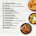Horkovzdušná fritéza s grilem díky vysokorychlostní 360° cirkulaci vzduchu ušetří čas strávený v kuchyni, energii i zdraví. Nastartuje vaši cestu lepšího životního stylu, neboť oblíbená smažená jídla připraví s využitím až o 80 % menšího množství tuku. Rovnoměrného propečení dosahují pokrmy pronikáním infračerveného světla. Ještě více možností přípravy jídel poskytuje unikátní technologie umožňující otáčení horní části o 180°, a to především ve spojení s grilovací a hlubokou pánví, jež jsou součástí balení.