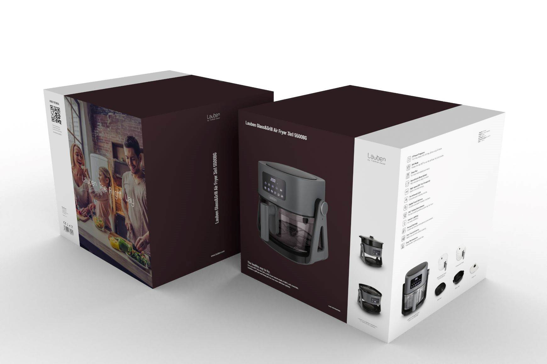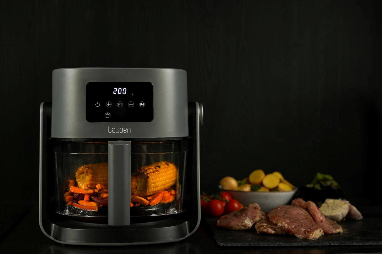 Zdravé vaření nebylo nikdy snazší a nemusíte se vzdávat ani oblíbených smažených dobrot. Horkovzdušná fritéza s grilem Lauben Glass&Grill Air Fryer 3in1 5500BG přináší zcela novou dimenzi přípravy pokrmů využívající až o 80 % méně tuku. Unikátní skleněný koš s viditelností 360° zajišťuje ničím nenarušenou chuť a vůni jídla, zároveň umožňuje jeho snadnou kontrolu během přípravy, a to i díky vnitřnímu osvětlení. Vaření urychluje 6 přednastavených programů, ale teplotu a čas lze nastavit i manuálně na digitálním dotykovém displeji. O rovnoměrné propečení se stará infračervené světlo, pomocí otočné horní části o 180° spolu s použitím přiložené grilovací či hluboké pánve získáte více možností přípravy. Fritovací koš je chráněn bezpečnostním krytem proti popálení, pachový filtr zase chrání domácnost před nepříjemným odérem. Čas ušetříte při vaření i údržbě, příslušenství stačí jen vložit do myčky. Praktické rady pro použití přináší video tutoriál.