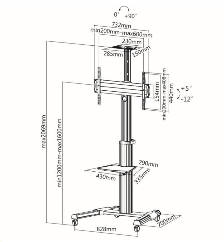 Levný profesionální Tv stojan Fiber Novelty FN7000 Nastavení výšky 120-160cm, náklon Tv, pojezd, 2x police, vedení kabeláže, VESA standard, PIVOT, nosnost 50kg.Více
