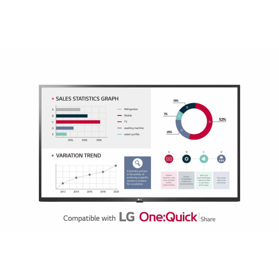 Vestavěný čtyřjádrový procesor SoC může provádět několik úkolů najednou a současně zajistit plynulé přehrávání obsahu bez potřeby přehrávače médií. Platforma LG webOS smart signage také zvyšuje pohodlí uživatelů pomocí intuitivního grafického uživatelského rozhraní a jednoduchých nástrojů pro vývoj aplikací.