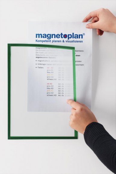 Magnetický rámeček Magnetofix, zvýrazní dokument. Pro formát velikosti A4 tj. 297×210 mm. Matný antireflexní povrch průsvitné fólie. Šířka barevného rámečku 9 mm. V místě barevného rámečku je fólie podlepená magnetickou páskou. Rámeček tak lze umístit na magnetický povrch tabule nebo vitriny. Pod rámečkem vložený dokument lze velmi snadno vyměnit..