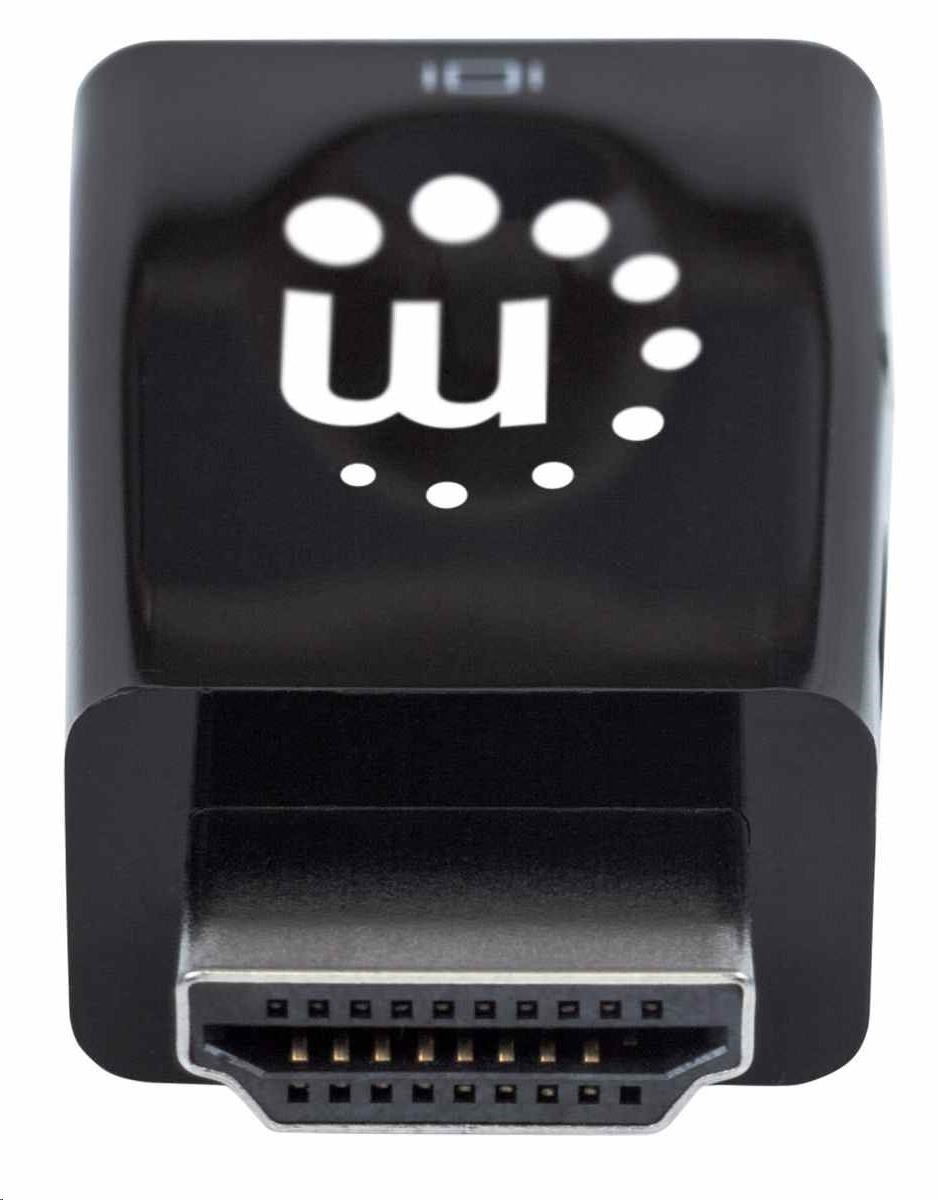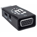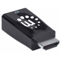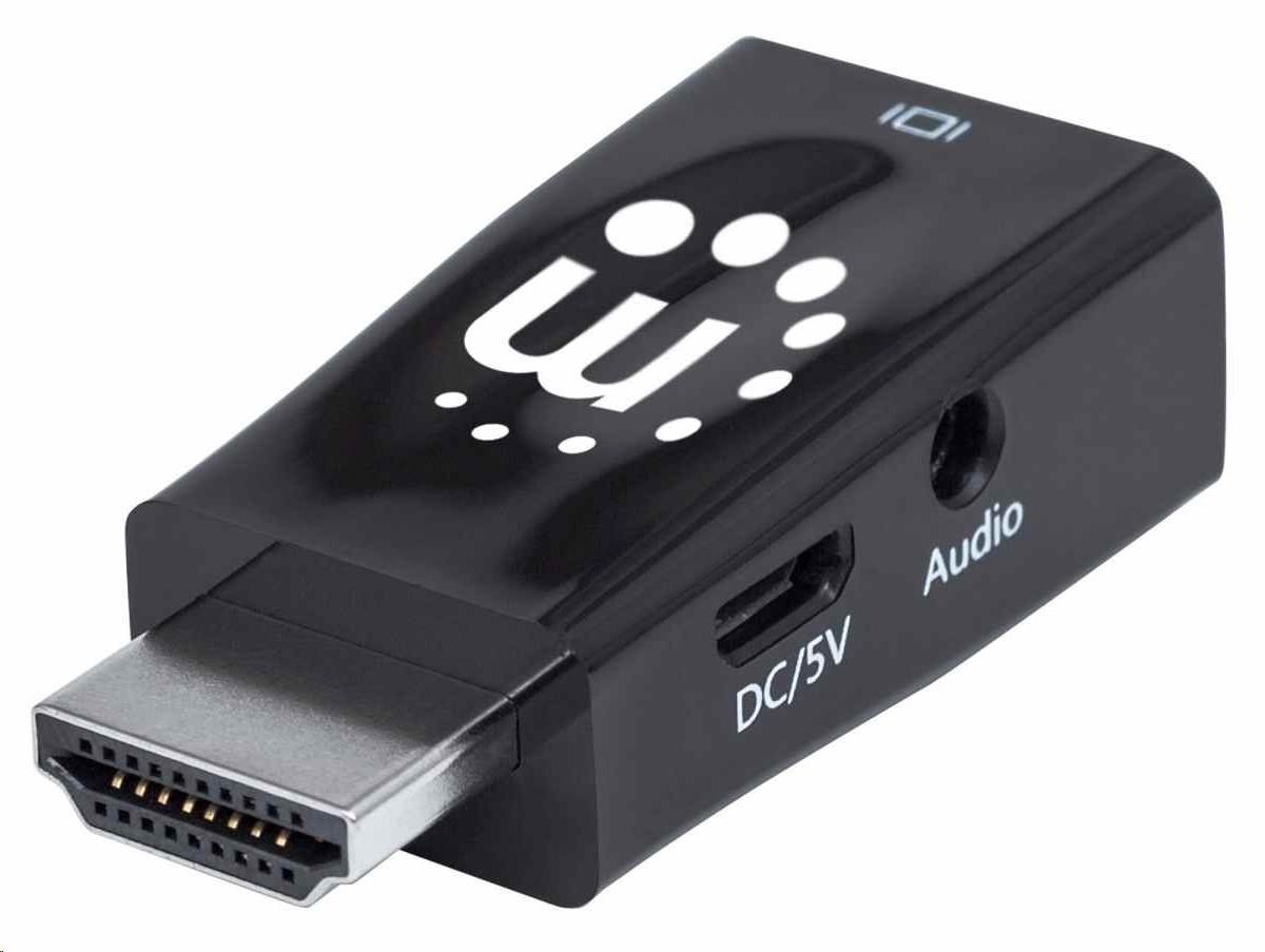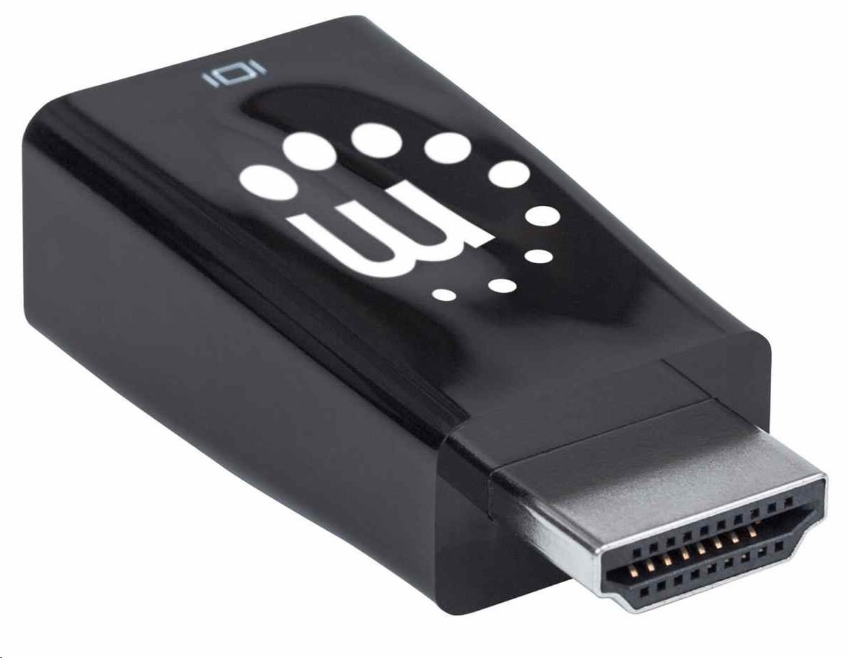 The Manhattan HDMI to VGA Micro Converter establishes a fast, simple and convenient link between a newer HDMI-equipped desktop, notebook computer or other media source and an existing VGA monitor, projector or other display device. The Manhattan HDMI to VGA Micro Converter is easy and quick to install and requires no complicated configuration or setup. This converter helps extend the service life of legacy VGA display equipment so you can get the most out of your investment and fully realize its value. The Manhattan HDMI to VGA Micro Converter offers a low-power, cost-effective and reliable solution so users can transition to HDMI bandwidths, resolutions, Deep Color and more without the expense of upgrading to newer and costly monitors and projectors. Its integrated, all-in-one design helps achieve a compact, integrated solution that eliminates unnecessary cables, tangles and clutter to keep installations and workspaces neat and orderly. Its 3.5 mm stereo port allows the converter to transmit audio to an external audio device, and its Micro-USB port allows for additional power if required.