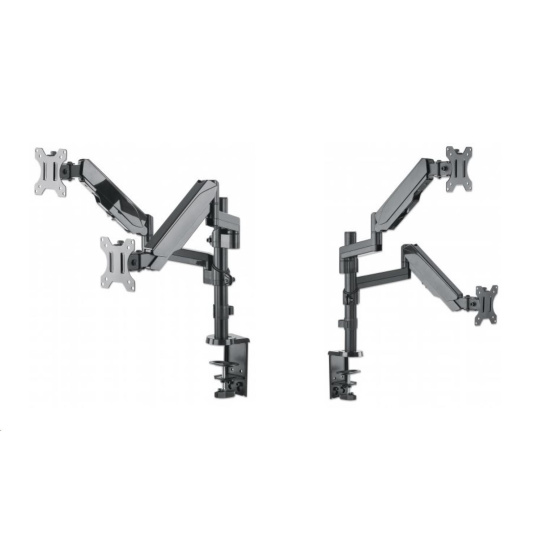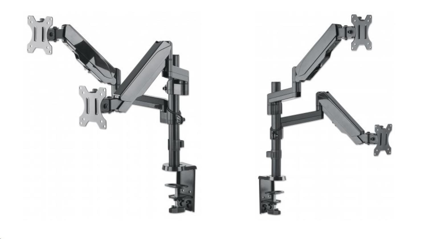 The Manhattan Universal Gas Spring Dual Monitor Mount securely supports two 17" to 32" TVs or monitors. Because it uses gas springs to hold your displays, the arms only need the lightest touch to move them to the best viewing angles for your purposes. The mount's high-quality aluminum and steel construction will provide years of reliable service. Ideal for installation on a large desk, the Manhattan Universal Gas Spring Dual Monitor Mount lets you take advantage of the extra range of movement so you can have more space to get work done.