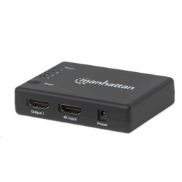 The Manhattan 4K 4-Port HDMI Splitter with built-in booster streams a 4K HDMI signal from a single UHD source to up to four UHD displays.