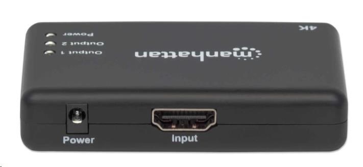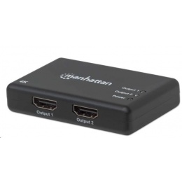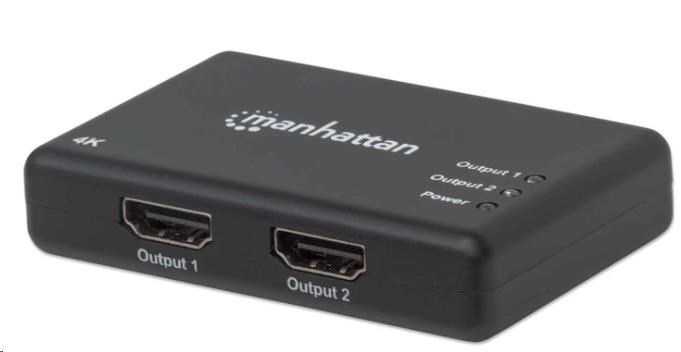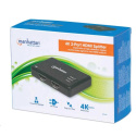 The Manhattan 4K 2-Port HDMI Splitter with built-in booster streams a 4K HDMI signal from a single UHD source to up to two UHD displays.