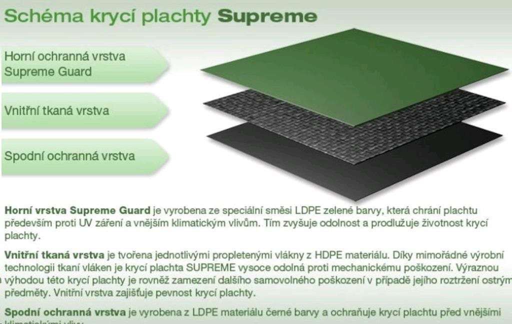 Díky použití ochranné vrstvy Supreme Guard je krycí plachta Supreme pevnější a lépe odolává povětrnostním vlivům – nejedná se ale o zimní plachtu a používání při teplotách pod bodem mrazu životnost krycí plachty snižuje.