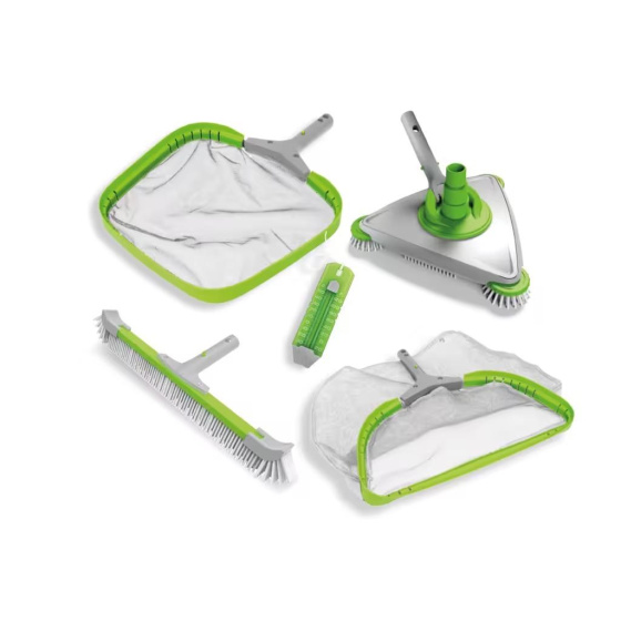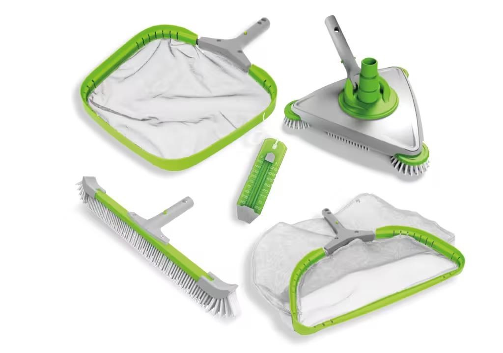 Komplatní sada Premium pro čištění nadzemních bazénů. Jednoduše napojíte na filtrační systém a můžete uklízet. Sada obsahuje vakuovou sací hlavu s rotačními kartáči. kartáč na stěny, hladinovou i dnovou síťku a teploměr.