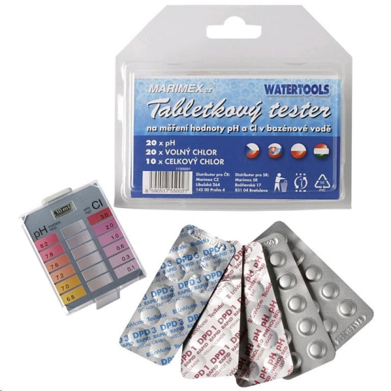 Marimex tester na pH a chlor. koncentraci je tabletový tester na tvrdost vody.