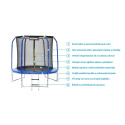 Vnitřní ochrannou síť najdete přímo v balení, nemusíte si ji dokupovat zvlášť. Vnitřní ochranná síť je bezpečnější než vnější síť - brání přístupu skákajícího do části s pružinami. Vstupní prostor je zajištěn třemi přezkami a brání vypadnutí. Tyče jsou obaleny ochranným návlekem z měkčené pěny. Nohy trampolíny jsou samostatné a zvyšují stabilitu celé trampolíny. Spojení tyčí nohou trampolíny a sítě je jištěno speciálními sponami.
