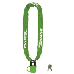 Zpevněný ocelový řetěz s ocelovým visacím zámkem je 90 cm dlouhý a obsahuje ocelové spojky o průměru 6 mm, které odolávají řezání. Nylonový kryt řetězu zabraňuje poškrábání. Visací ocelový zámek o průměru 40 mm je odolný proti povětrnostním vlivům. Plastový kryt na visacím zámku zabraňuje poškrábání. Třmen s průměrem 9 mm je vyroben z oceli pro odolnost proti řezání. Obsahuje 4-kolíkový válec zabraňující vyhmatání a dvojitou západku odolnou proti vypáčení.