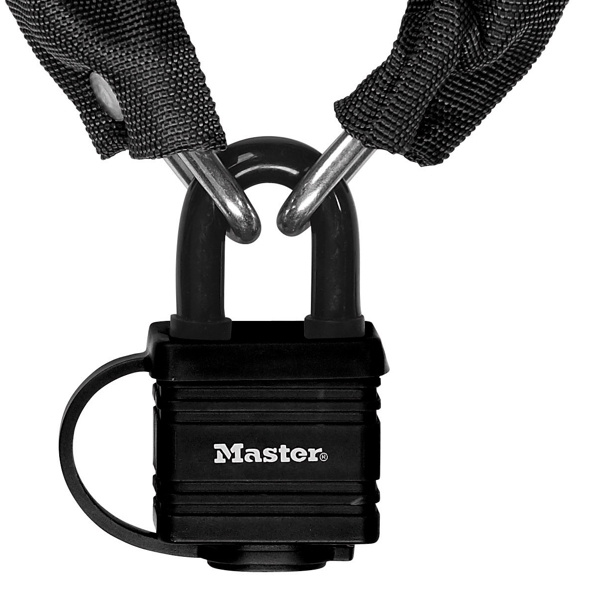 Zpevněný ocelový řetěz s ocelovým visacím zámkem je 90 cm dlouhý a obsahuje ocelové spojky o průměru 6 mm, které odolávají řezání. Nylonový kryt řetězu zabraňuje poškrábání. Visací ocelový zámek o průměru 40 mm je odolný proti povětrnostním vlivům. Plastový kryt na visacím zámku zabraňuje poškrábání. Třmen s průměrem 9 mm je vyroben z oceli pro odolnost proti řezání. Obsahuje 4-kolíkový válec zabraňující vyhmatání a dvojitou západku odolnou proti vypáčení.