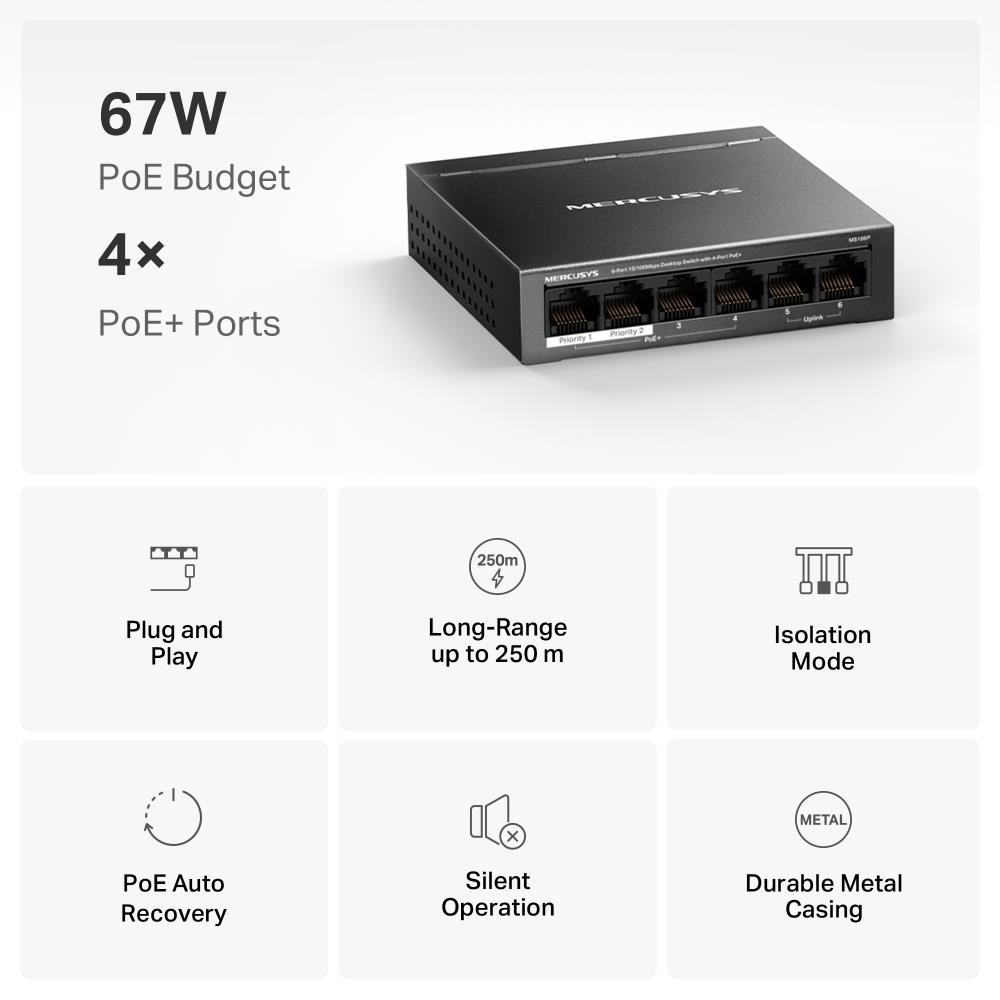 | Package Contents | 6-Port 10/100Mbps Desktop Switch with 4-Port PoE+ (MS106P) Power Adapter Quick Installation Guide |