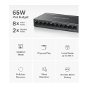 | PoE Ports | RJ45 Standard: Compliant with 802.3 af/at Powered Devices PoE Ports: Port 1- Port 8 PoE Power Budget: 65 W |