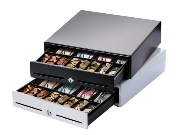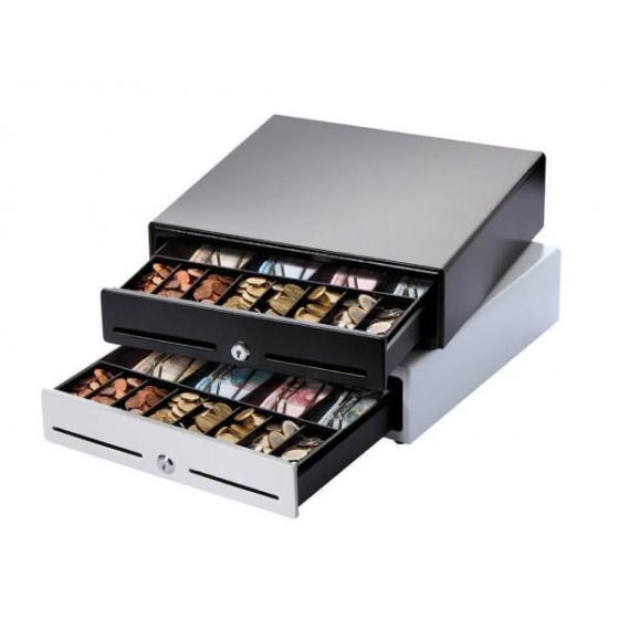 cash drawer, front opening, dimensions (WxHxD): 330x101x330mm, insert: 4 note compartments (horizontal), 8 coin compartments, 1 receipt compartment, 3-pos. lock, direct printer connection, RJ12, colour: black.