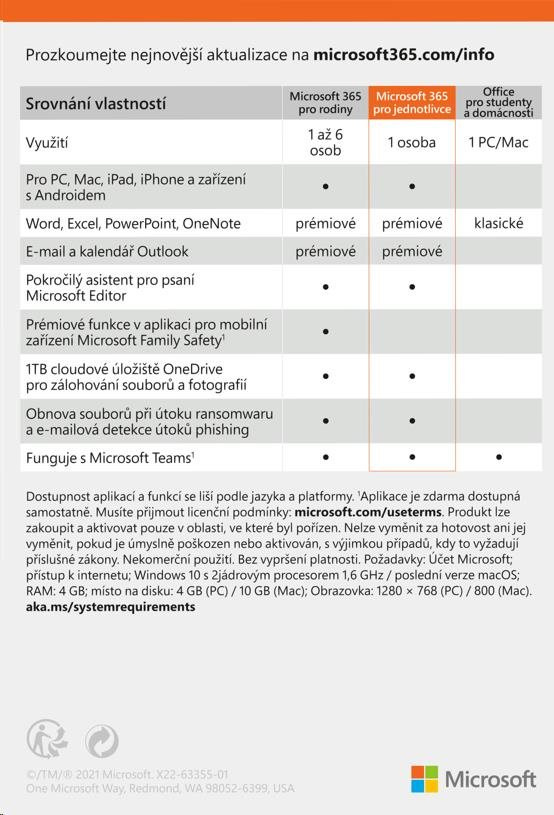 Popis Microsoft 365 pro jednotlivce CZ (1rok)