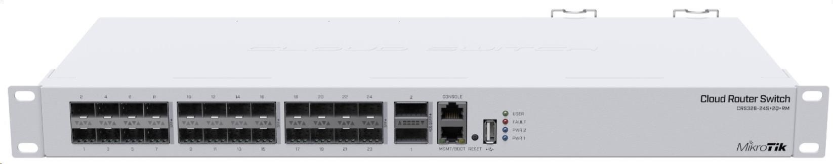 MikroTik Cloud Router Switch CRS326-24S+2Q+RM, 650MHz CPU, 64MB, 1x10/100, 24x10G, 2x40G, USB vč. L5