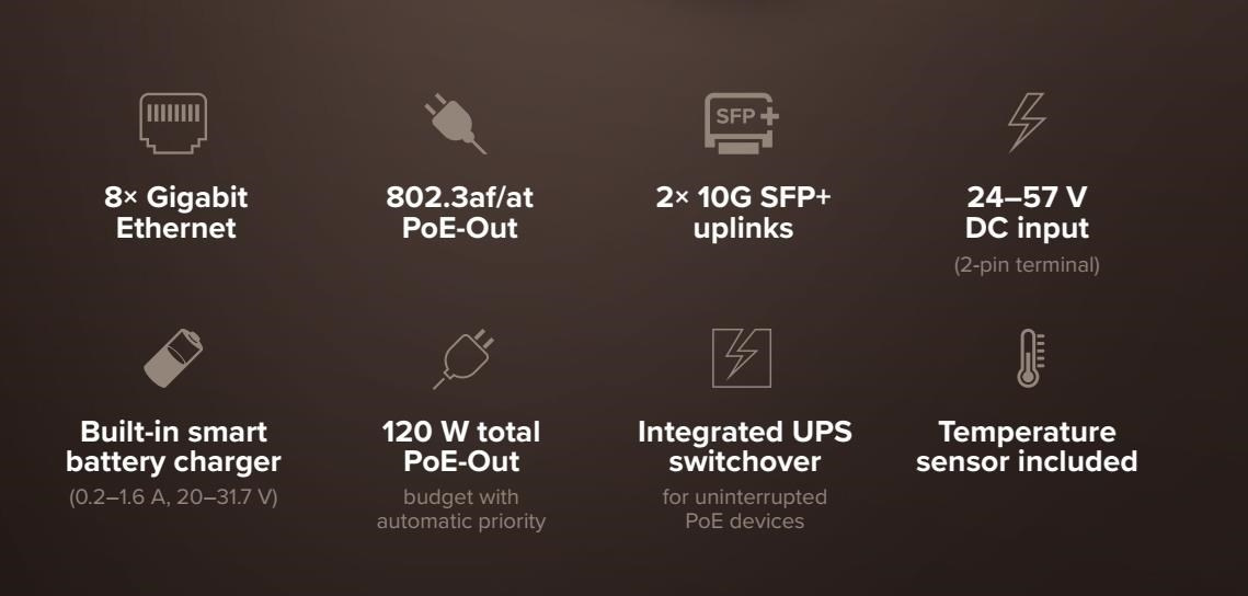 Popis MikroTik CSS610-8P-2S+OUT Venkovní PoE switch s UPS netPower Lite 8P