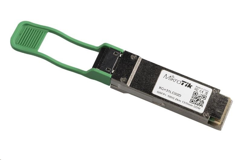 XQ+31LC02D je Singlemode modul QSFP28 s maximální propustností 100 Gbps, 4 kanály, vlnové délky1271nm, 1291nm, 1311nm, 1331nma dva LC konektory pro připojení do vzdálenosti2 km. Modul je kompatibilní se všemi aktivními prvky od MikroTik a také se zařízeními jiných výrobců "cisco compatibile" s portem QSFP28.