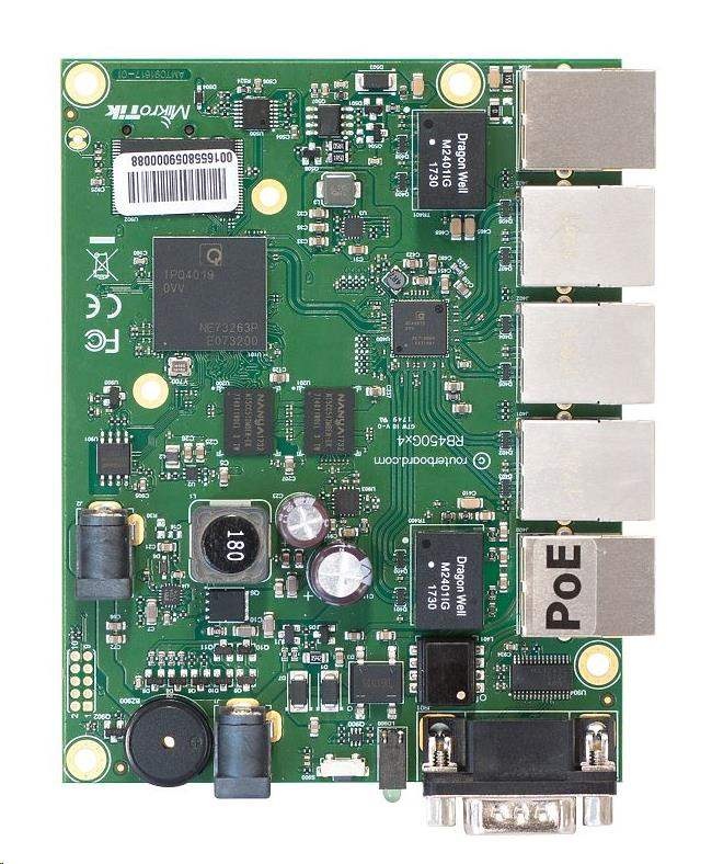 MikroTik RB450Gx4 je 5ti portový Gigabitový router se sériovým portem, 512MB pevným diskem a microSD slotem. Jako vylepšení oproti předchozím verzím kromě pasivního napájení přes PoE (10 až 57V DC) router podporuje také aktivní napájení 802.3af/at. Dalším vylepšením je PoE-Out funkce na portu č.5, který umí pasivně napájet další zařízení a to napětím, kterým je samotný RB napájen.