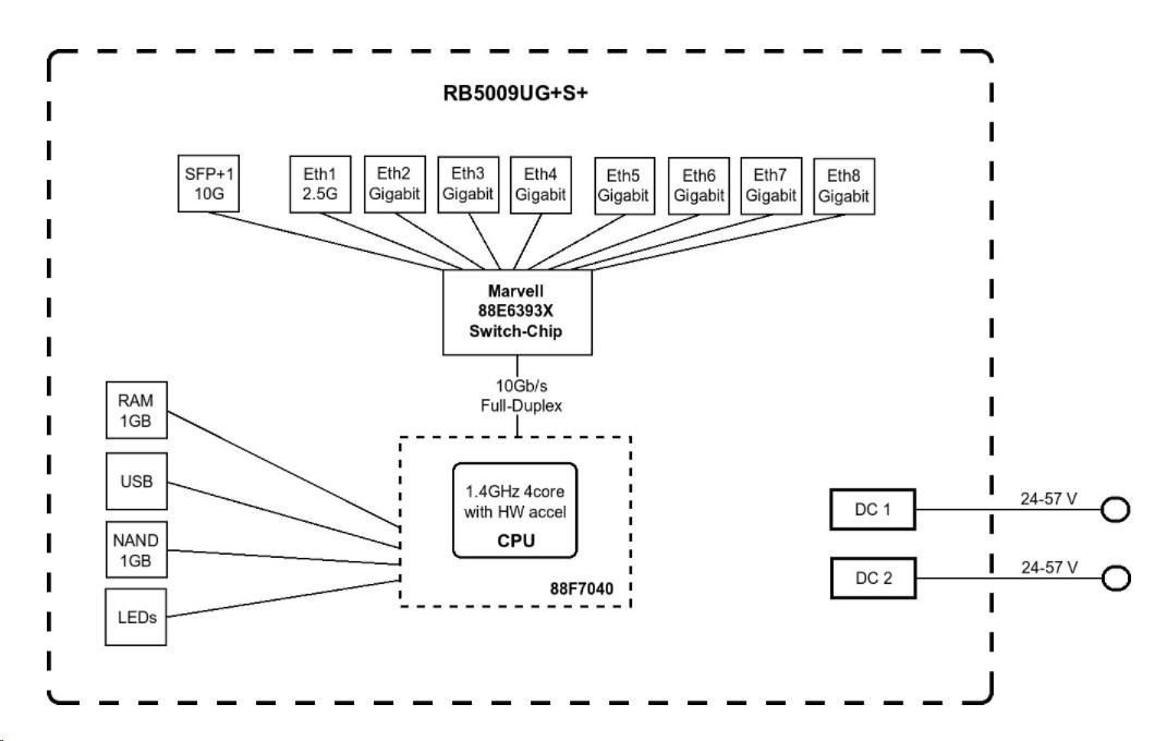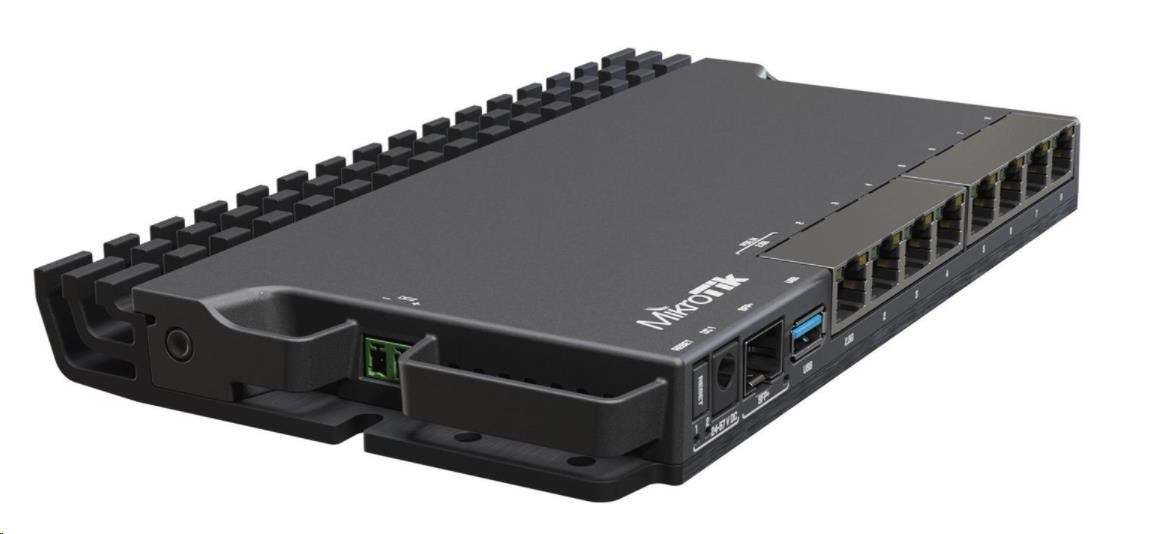RB5009 je zcela nová řada RouterBOARDů, která přichází s pasivním chlazením, inovativním až futuristickým designem a vysokým výkonem (o 60-90% vyšší než RB4011) o který se zasluhuje 64bit ARM architektura procesoru s taktem 1400 MHz, 1GB RAM typu DDR4 a 1GB NAND uložiště. Router disponuje 7x Gigabit LAN, 1x 2.5Gbit LAN s možností napájení přes PoE (24-57VDC, 802.3af/at) ale také přes DC jack či svorkovnici z levého boku, 1x SFP+ slot a 1x USB 3.0. Právě díky designu kovového šasi je možné s dokoupitelným příslušenstvím namontovat router do 19" racku. Dokonce až 4 routery naráz se díky úsporným rozměrům vměstnají do 1U výšky!