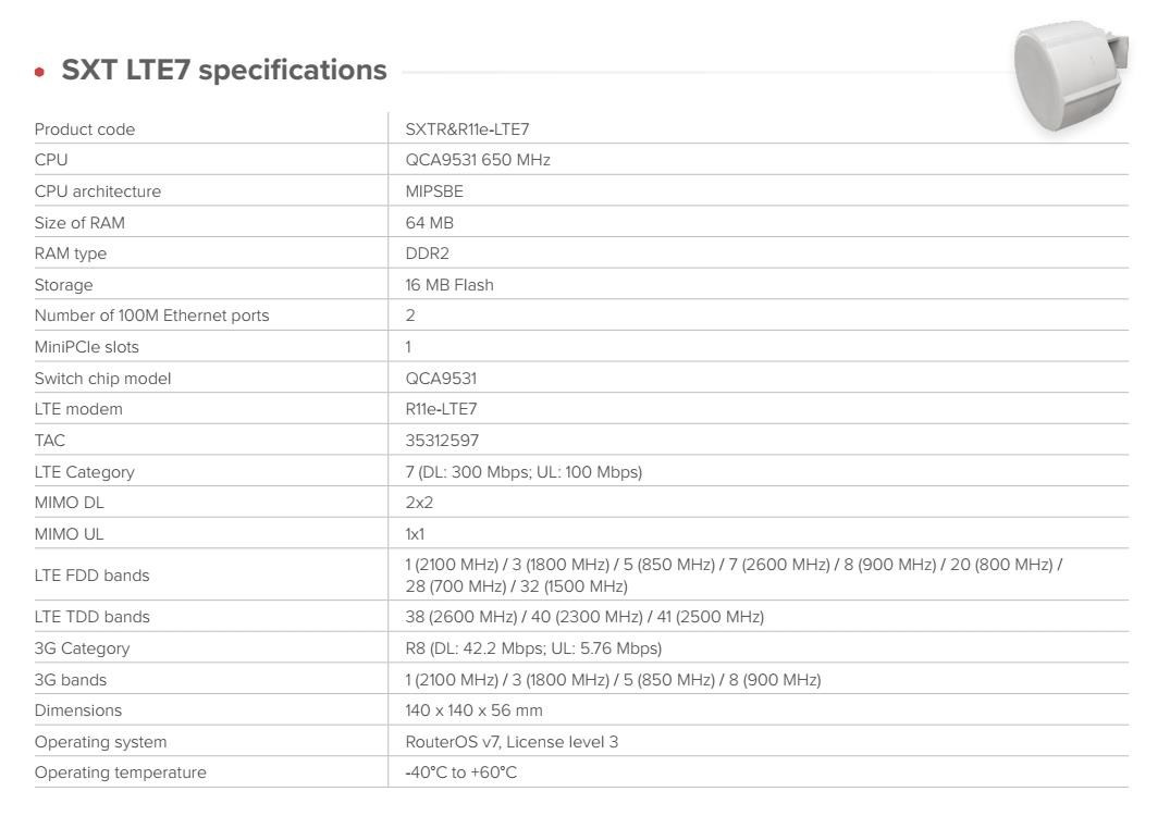 Robustní venkovní LTE CPE s novým modemem R11e-LTE7 poskytuje stabilní a rychlý internet. Řešení pro lokality, kde telefony selhávají – ideální pro farmy, připojení mimo síť a venkovské nemovitosti. Nyní s lepším uplinkem, PoE vstupem i výstupem a širokým rozsahem napájení 12–57 V. Namontujte, připojte a zůstaňte online S rychlejším uploadem. S nižšími latencemi. Stejný osvědčený decentní design SXT, který zůstává skrytý na první pohled. Proč upgradovat na CAT7? • Dvojnásobná rychlost uploadu • Rozšířená podpora frekvencí – nyní zahrnuje pásmo 32 (1500 MHz) pro ještě lepší výkon v přetížených oblastech. • Stejný osvědčený design – žádné změny v instalaci nebo konfiguraci. • Nižší náklady – lepší konektivita, která ve skutečnosti stojí méně. Všechna nová zařízení CAT7 také podporují 2×2 MIMO DL a agregaci pásem. To znamená, že mohou současně využívat více pásem LTE. To je obrovská výhoda, když je v dané oblasti mnoho mobilních uživatelů. Nabízí lepší odezvu v přeplněném prostředí, vyšší účinnost v situacích se slabším signálem. Po zapnutí agregace pásem jsme zaznamenali zdvojnásobení rychlosti internetu ve venkovských oblastech. Součástí dodávky: - 1x outdoor jednotka RBSXT - 1x montážní příprava k uchycení jednotky na stožár/konzoli - 1x 24V 1.2A napájecí zdroj - 1x POE injektor - 1x teplovodivá chladící podložka Technické specifikace: Product code: SXTR&R11e-LTE7 CPU: QCA9531 650 MHz CPU: architecture MIPSBE Size of RAM: 64 MB RAM type: DDR2 Storage: 16 MB Flash Number of 100M Ethernet ports: 2 MiniPCIe slots: 1 Switch chip model: QCA9531 LTE modem: R11e-LTE7 TAC: 35312597 LTE Category: 7 (DL: 300 Mbps; UL: 100 Mbps) MIMO DL: 2x2 MIMO UL: 1x1 LTE FDD bands: 1 (2100 MHz) / 3 (1800 MHz) / 5 (850 MHz) / 7 (2600 MHz) / 8 (900 MHz) / 20 (800 MHz) /28 (700 MHz) / 32 (1500 MHz) LTE TDD bands: 38 (2600 MHz) / 40 (2300 MHz) / 41 (2500 MHz) 3G Category: R8 (DL: 42.2 Mbps; UL: 5.76 Mbps) 3G bands: 1 (2100 MHz) / 3 (1800 MHz) / 5 (850 MHz) / 8 (900 MHz) Dimensions: 140 x 140 x 56 mm Operating system: RouterOS v7, License level 3 Operating temperature: -40°C to +60°C Napájení: DC input: PoE-In PoE-In input Voltage: 12-57 V Power adapter nominal voltage: 24 V Power adapter nominal current: 1.2 A PoE-in: 802.3af/at PoE-Out: Passive PoE up to 57V (Ether2) Max power consumption without attachments: 7 W Max power consumption: 24 W Upozornění: Výrobce Mikrotik neposkytuje záruku na zařízení poškozená přepětím. Zařízení je třeba adekvátně chránit proti indukovanému elektrostatickému přepětí či přepěťovým špičkám na silovém vedení. Pro venkovní instalace používat výhradně stíněnou kabeláž (FTP/SFTP) a jednotky korektně uzemnit (prostřednictvím integrovaného zemnícího členu či použitím ethernetové přepěťové ochrany)..