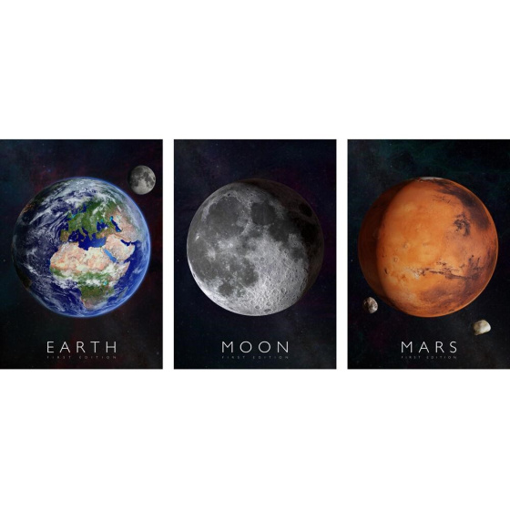 Balení obsahuje 3 plakáty: Země, Měsíc a Mars. Plakáty jsou vytištěny na odolném papíře ve velikosti A1 (594 × 841 mm).