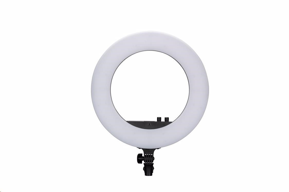 Stmívatelné dvoubarevné LED kruhové světlo Nanlite Halo 18 s napájením pomocí AC adaptéru. Součástí balení je také držák na telefon a oboustranné make-up zrcátko.