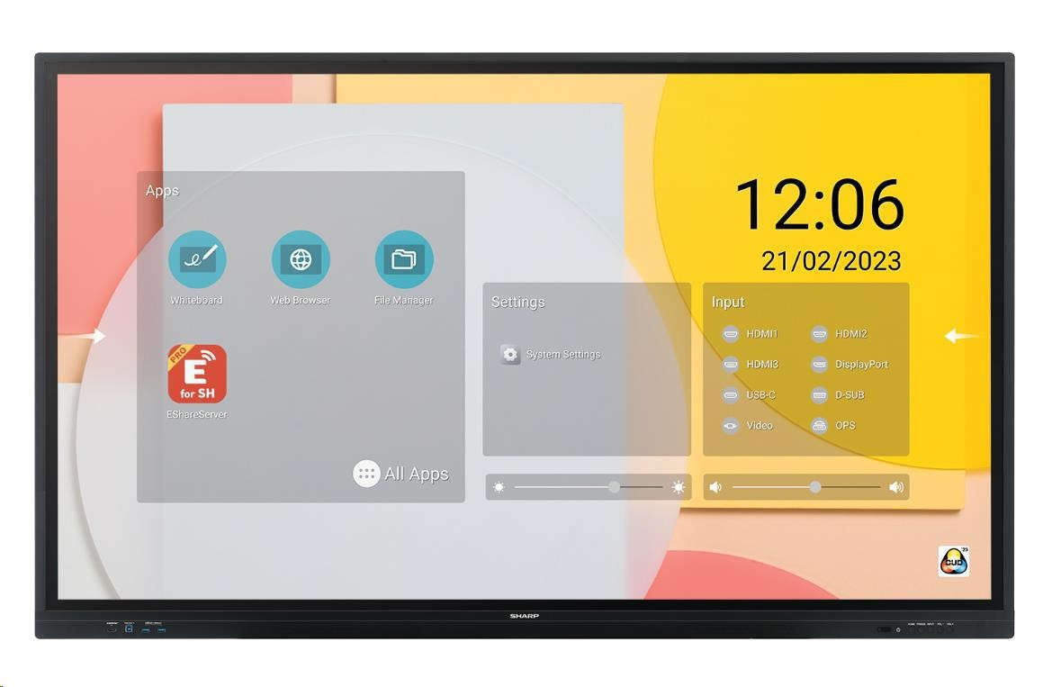 | Vestavěné aplikace | Správce souborů; Výběr vstupu; Nastavení; Webový prohlížeč; Tabule; Bezdrátové sdílení obrazovky - E-Share |