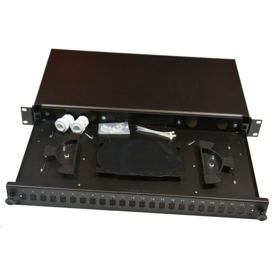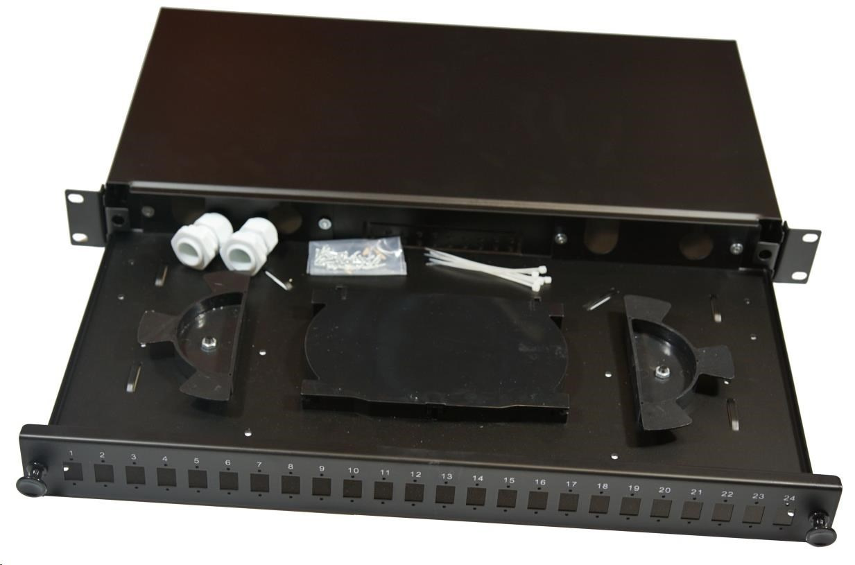 Optická vana výsuvná 1U, 24x SC simplex (24x LC duplex, 24x E2000) s kazetou pro 24 svarů, černá