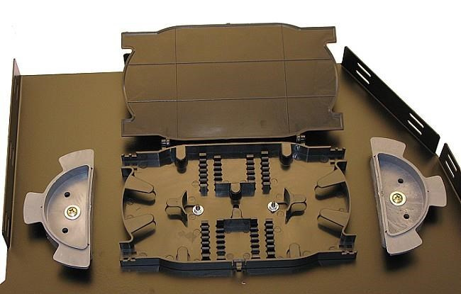 19" rozvaděč, 1U, pro 24 simplex adaptérů SC nebo duplexních LC, barva černá, kovová skříň, kazeta na 24 svarů Skříň je výsuvná/otočná na pantu. Místo pro kabelový přívod a vyvázání patch kabelů. Součástí čelní kovový kryt na ochranu patch kabelů.