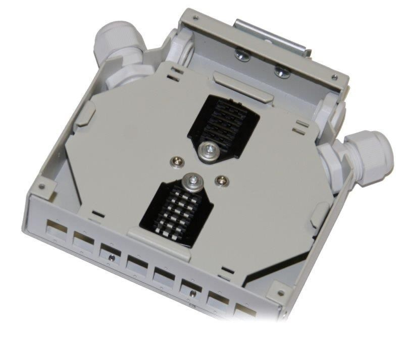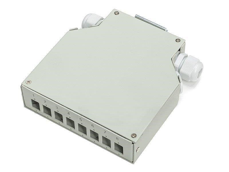 Popis Optický rozvaděč na DIN lištu 8x SC simplex (8x LC duplex) s hřebínky na 16 svarů, bílý