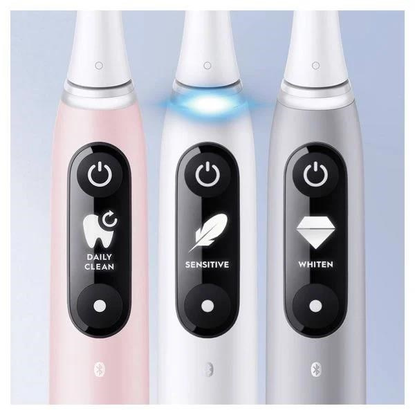 Oral-B iO pomáhá chránit dásně před přílišným tlakem. Inteligentní kontrola tlaku varuje červeným světlem, pokud vyvíjíte příliš velký tlak, a rozsvítí se zeleně, pokud používáte optimální tlak. Interaktivní displej umožňuje snadnou orientaci v různých funkcích a nastaveních kartáčku. Můžete si vybrat mezi různými režimy čištění, v reálném čase obdržíte personalizované pokyny a upozornění na nutnost výměny hlavice kartáčku. Vizuální časovač poskytuje informace o doporučené době čištění 2 minuty. Zubní kartáček vás ráno přivítá a po vyčištění zubů vám vykouzlí úsměv na tváři pro vynikající výsledky. Zažijte zážitek z čištění zubů, který vás inspiruje!