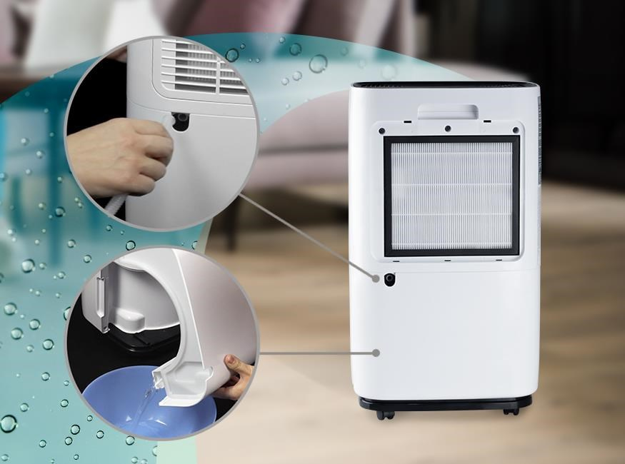 Zkondenzovaná voda se automaticky shromažďuje ve 4litrové sběrné nádobě, kterou lze snadno vyjmout a vylít. Nebo můžete ke spotřebiči připojit přiloženou hadici pro průběžné vypouštění přímo do kanalizace.